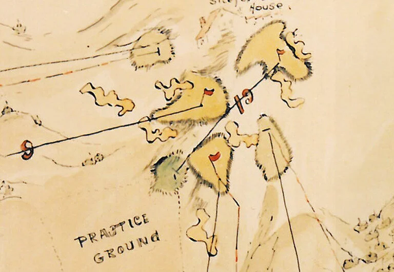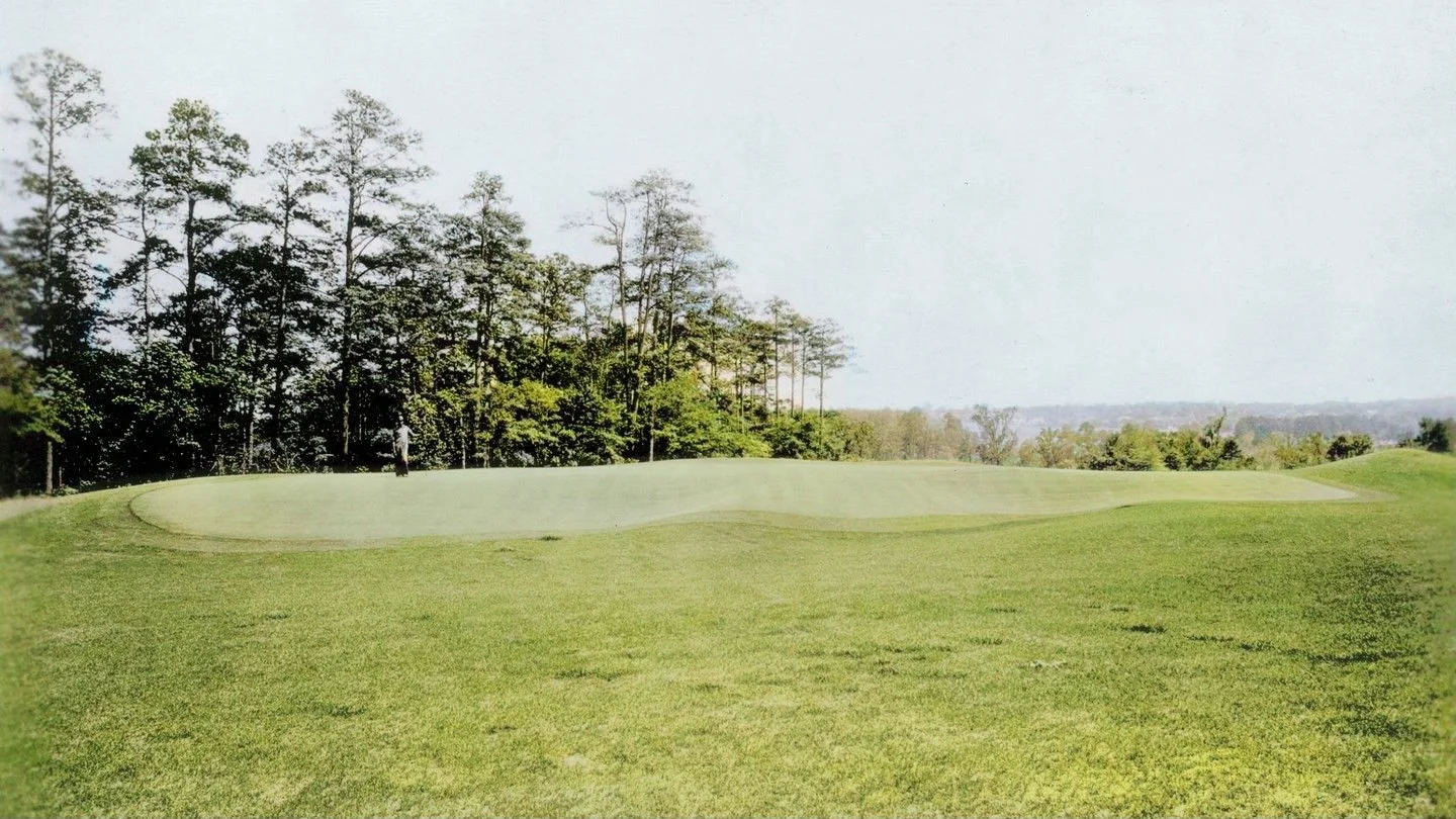 A three-shot hole up hill. The green is in a punch bowl surrounded by large hillocks nine to twelve feet high. It is completely visible for the third shot and a player who is sufficiently long to get up in two, will be able to define the position of the green owing to the size of the surrounding hillock. It may be compared to the Seventeenth Green at Muirfield (Scotland).