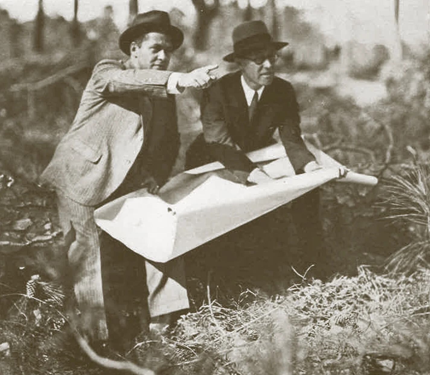 Certain holes of the Augusta National course have been cut through pine forests. Here Bob Jones and Wendell P. Miller, in charge of the construction, are on the ground going over application of the plans in detail.